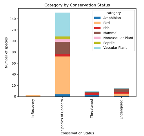 It was found that a large majority of species had the conservation status of Species of Concern. The three largest affected categories were birds, vascular plants, and mammals. Analysis of the conservation status by genus found that the genus Myotis had the most separate species represented with conservation statuses. The genus Myotis refers to the bat, so it can be concluded that national parks are maintaining environments in which bat populations may be able to recover. Overall, national parks are safe havens for at-risk species, and expanding the ecosystems that we see in these parks could help to give these species a better chance at survival.
