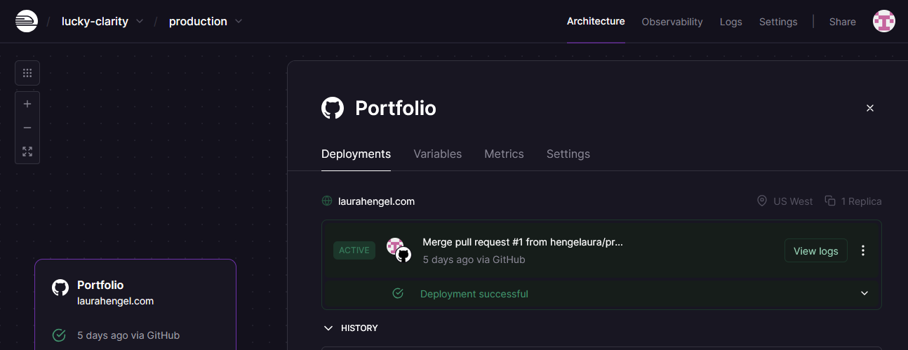 I deployed my site using Railway by connecting to the python and html code in my Portfolio repository on GitHub. Feel free to examine my code by visiting my GitHub profile!